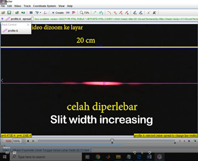 | 3.Exploration | To test their hypothesis, students need to do an investigation. In normal laboratory work, students would do hands-on experiments directly. However, in this online course, instead of a hands-on experiment, the lecturer provided a recorded video of the diffraction experiment with a single slit. The video showed the diffraction pattern when the slit width, screen-slit distance, and light wavelength were varied. Students had to import the video to Tracker and then plot the diffraction pattern's intensity distribution with the Line Profile feature in Tracker (see Figures 1 and 2). | Moodle |