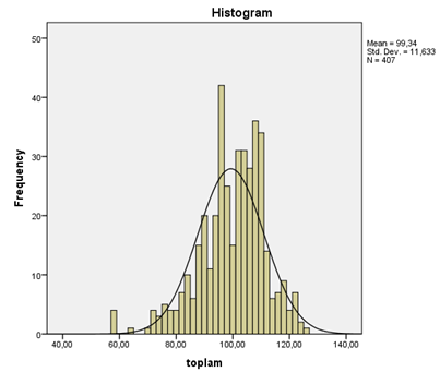 Within the scope of the research, firstly the answers obtained from the pre-service teachers were transferred to SPSS 23.0 program and it was determined whether there were missing and incorrect data entries. After the data analysis, the total scores of the pre-service teachers towards multicultural perceptions were calculated and outlier analysis was conducted. It was extracted from the 3 outlier data observation data sets. Then, skewness and kurtosis coefficients were calculated for the purpose of normality analysis. The coefficient of skewness was -0.707 and kurtosis was 0.978. Büyüköztürk (2008) states that skewness-kurtosis coefficients between ± 1 indicate that the data set is normally distributed. In addition, a histogram graph was created and it was determined that the data set did not deviate from the normal distribution as shown in Figure 1.