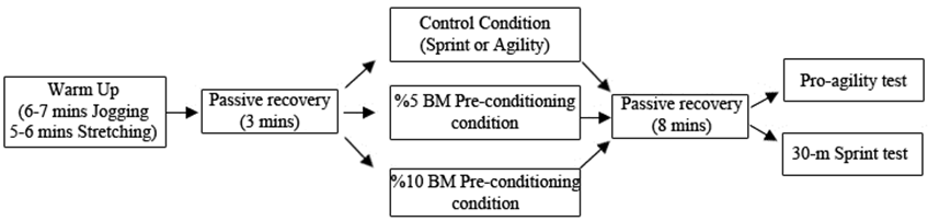 Before the pre-test, participants were given a certain amount of time for standard warm-up practices and a reasonable time was provided for stretching after the warm-up period. And after the warm-up period, PC was started. For PC, 8 minutes before for each 30 meter sprint and pro agility tests, they did a resistance running with weight vests corresponding 5% and 10% of their body weights once. Since the optimal resting time is 8 to 12 minutes for optimal potentiation after PC, (Bevan, Owen, Cunningham, Kingsley, & Kilduff, 2009; Gouvêa, Fernandes, César, Silva, & Gomes, 2013) after this 1 repeat maximal resistance running and agility, they were given an 8 minute passive resting time and then again started on 1 repeat 30 meter sprint and agility tests. A minimum of 48 hours resting period was provided between the sprint rest day and the agility tests. With that, they were participated in evaluations 5 times in total, once for the pre-test, and twice for each agility and sprint tests which were performed after the PC, executed with mentioned %5 and 10% body weight corresponding weight vests and as resistance running Figure 1.