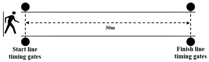 Sprint acceleration performances of participants were evaluated with 30m sprint run tests. A photocell and its reflectors, which were approximately 2 meters apart from the starting line and the 30th meter, were placed mutually Figure 2. Sprint tests were tested on an indoor athletic track (Smartspeed, Fusion Sport, Australia), with an electronic stopwatch system which started the time as the participant ran through the first sensor and recorded the participants’ run time between the 0 and 30 meter sensors with an accuracy of 0.01s. Sprint run started at the moment determined by the participant within the area determined by a line which was 1m behind the starting point and at the moment when the participant hit the photocell on the starting line with a forward movement without a backwards move and completed when they hit the 30m line sensor. The participants were given the necessary information that they needed to run mentioned 30m distance as quickly as possible and at a maximum speed before each test. Before the sprint tests, the participants did a standard 10 minute warm-up with low-intensity acceleration runs and various incremental running exercises (Woolford, Polglaze, Rowsell, & Spencer, 2013). A maximal 30m run was executed 8 minutes after the PCs performed with %5 and %10 body weight corresponding weight vests and as resistance running and recorded for level analysis.