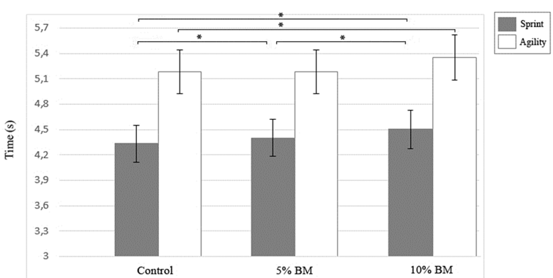 According to the analysis results, sprint after PC activity as resistance running with %5 and %10 of body weight [F(2, 28) = 20.616, p = 0.000, partial η2 = 0.596] and agility [F(1.453, 20.342) = 4.539, p = 0.033, influence quantity η2 = 0.245] data showed statistically significant difference.