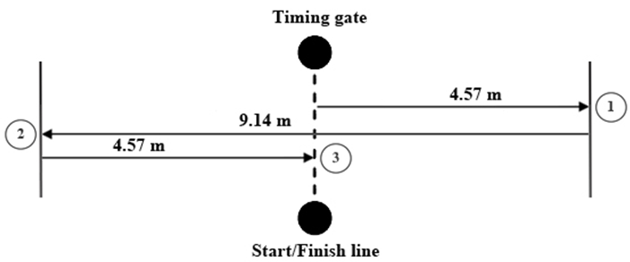 Figure-3. Graphic representation of pro-agility agility test (in this example, right side is shown as the first preference of direction). |