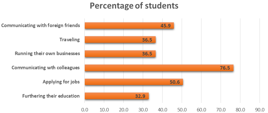 It can be seen that most of the students (76.5%) viewed that they would use English for communicating with their future colleagues, followed by for job application (45.9%). Therefore, the purpose of using English for these students were for work-related reasons, whereas using English for pursuing a higher degree came last (32.9%).