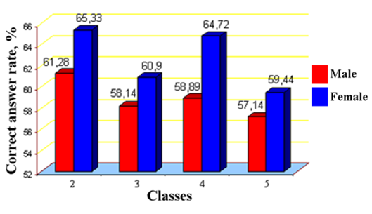 Figure-2. Comparison of correct response rates between male and female students among classes.