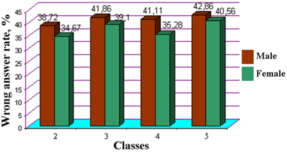 Figure-3. Comparison of wrong answer rates between male and female students among classes.