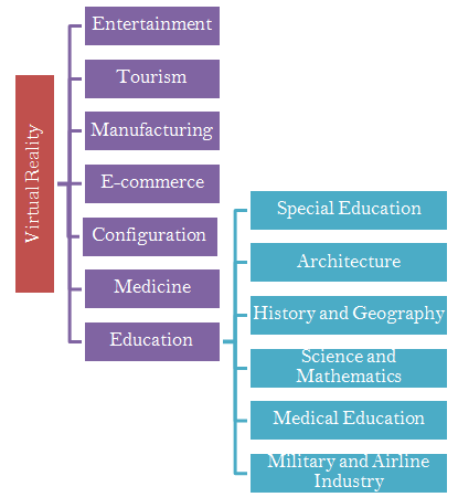 The concepts of VR and augmented reality are frequently confused with each other. Although augmented reality implementations are considered as a part of VR, it includes some differences. Augmented reality happens by placing virtual objects in real environments (Azuma, 1997). However VR can be defined as implementations by which individuals find themselves in a virtually created environment using various tools and interact with the environment (Çavaş et al., 2004; Carrozzino and Bergamasco, 2010) . As also Rheingold (1991) stated, VR could be defined as experiences which individuals could walk around in three dimensional environments, developed with computer technologies, and the environment could be observed from all angles. Generally, according to VR implementation definitions, the feelings that individuals directly interact with the environment and feel themselves in the related environment are emphasized. \ Today, VR implementations have continued their presence in many areas from tourism to education. VR implementations could be possibly encountered in a touristic destination advertising, historical elements presentation or in entertainment sector. Besides this wide range of use areas, developing and spreading of the current technology enable the increase use of VR implementations in education environments. Çavaş et al. (2004) classified use of VR in education environments and Başaran (2010) classified use of VR implementations in all areas. A combination of these two classifications was summarized in Graph-1.