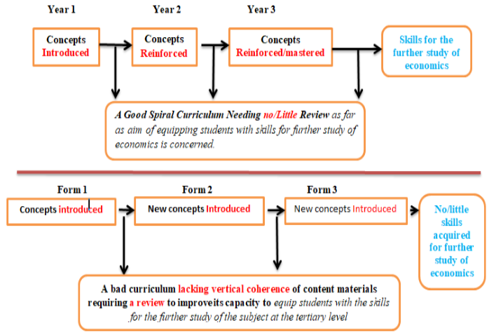 The school curriculum is usually designed around topics that allow for developing competencies as students master the principles and standards in increasing complexity (De-Juanas Oliva, Martín del Pozo, & Pesquero Franco, 2016). The present study focuses on how the topics and learning competencies in the SHS economics syllabus are sequentially arranged across three forms in a progressive spiral manner. Gibbs (2014) explained that the spiral curriculum designs seen in most schools’ curricula, despite covering many topics, do not enhance the acquisition of basic economic concepts that promote understanding of higher-level concepts. Experience has shown that students often lose ground in grasping concepts central to further studies in a particular discipline.