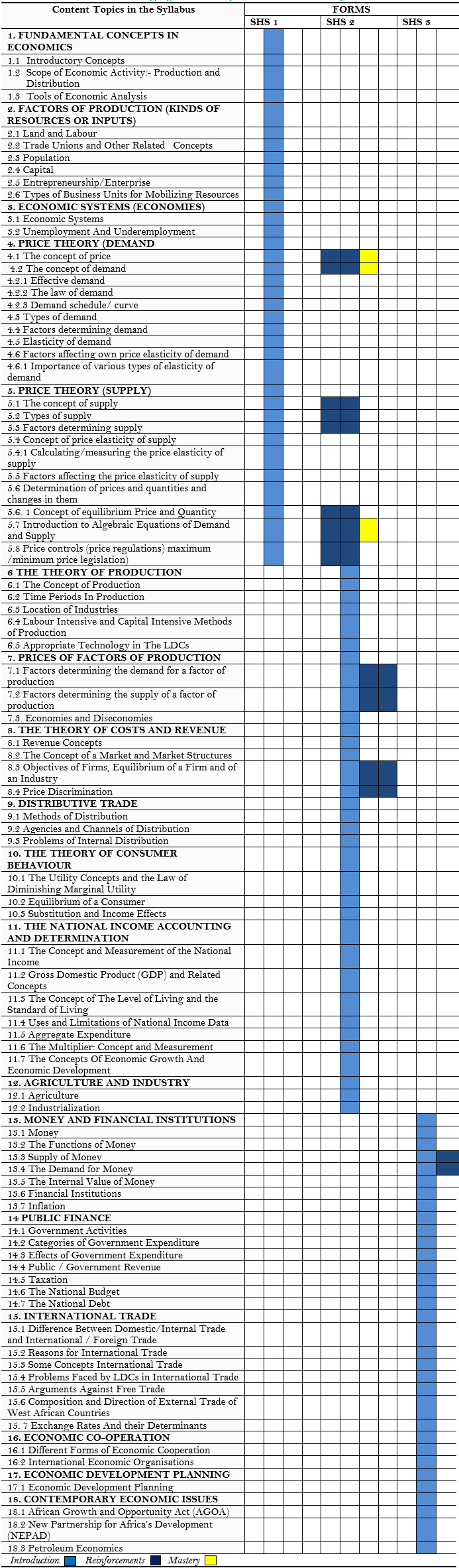 Students in Form 2 are expected to adopt a more robust approach to analyse complex economic phenomena. Students here are required to demonstrate an understanding of ‘the theory of production’, ‘prices of factors of production’, ‘the theory of costs and revenue’, ‘the theory of consumer behaviour’, ‘the national income accounting and determination’, and ‘agriculture and industry. The syllabus suggests several teaching strategies for teachers, some of which include explanations, leading of students to appreciate concepts, providing their data, for instance on MP, TP and AP at various levels of employment of a variable input, use of discussion the data with students and leading them to suggest definitions of the concepts. Some of the strategies help students to develop and assimilate higher-order concepts and analytical abilities (Shahrokh, 1998) that they require to study different scales of production in the succeeding units. The key learning competencies reinforce subsequent contents. Students in Form 3 are expected to demonstrate an understandingof ‘money and financial institutions’, ‘public finance’, ‘international trade’, ‘economic co-operation’, ‘economic development planning’, and ‘contemporary economic issues’.Clearly,there is no vertical linkage between the previous year’s content and the succeeding year’s topics. The essential content topics areas are expected to be introduced in Form 1 to further form Form 3. The student is supposed to be exposed to various tasks. Table 3 portrays the sequencing of the content in all fifteen topics in the three-year SHS economics programme. The figure sheds light on the introduction and reinforcement of those topics as students’ progress through the academic years. Teachers introduce topics depending on what the students have already acquired, such as the introductory concepts (scarcity, choice, scale of preference, and opportunity cost) in SHS 1 since they lead students to define economics. In Form 1, the concept of price is introduced, and this concept is reinforced indirectly with price discrimination in Form 2. After reinforcements of the concept of price, this paves the way for introducing conditions under which price discrimination thrives. A reinforcement of the concept deepens mastery of skills. The introduction of a topic is done when the teacher presents concepts for the first time. Preferably, topics that are introduced in Form 1 must be reinforced when it is re-introduced in a different manner. It needs to have more practise drills to help students deepen their understanding of novel concepts and correct their notional errors and delusions about earlier concepts. A mastery of the content is a demonstration of students’ firm understanding of the concepts. As one can see, all other things being equal, students master the concepts of demand and supply since they are reinforced as they move from one level to the other.