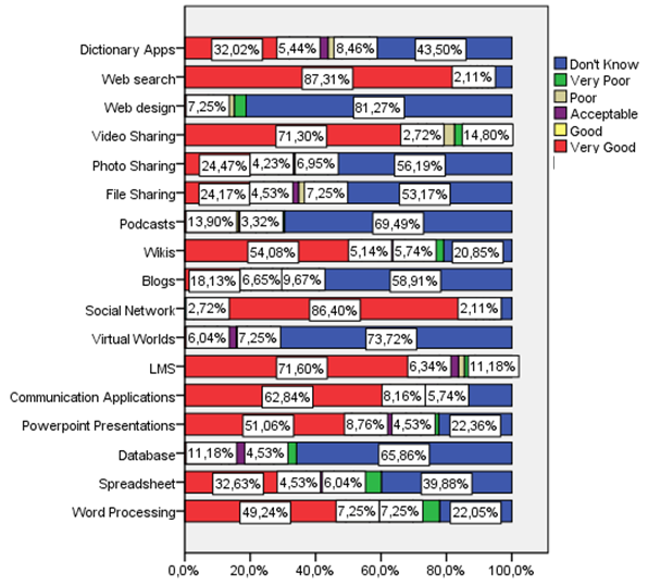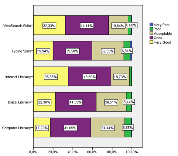 The mean average of L2 learners’ responses (mean = 3.85) reveals that they tended to assess their computer skills moderately high, or else as ‘Acceptable’, along the 5-point Likert scale they used to provide their self-assessments. As shown in Figure 1, most participants rated their typing, computer literacy and digital literacy skills as ‘Acceptable’, i.e. 32.2%, 34.4% and 30.5% or ‘Good’ 39.6%, 41.1.% and 41.4% respectively. Web search and internet literacy skills were rated as either ‘Good’, i.e. 44.1% and 43.5% or ‘Very good’ 32.2% and 35.3% respectively.