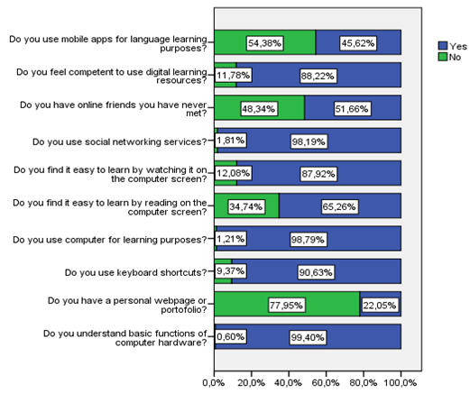 When asked whether they used computers, the Internet and mobile technologies for specific purposes in their everyday life as well as a means to facilitate the language learning process on a regular basis, the participants in our study answered affirmatively in 74,78% of cases, with the exception of statement #2 that related to the ownership of personal homepages (Figure 2). Notably, their responses seem to be equally divided in statements #8 and #10 with 51.7% (171) of our learners reporting having online friends they have never met as opposed to 48.3% who do not, and 45.6% (151) of them attesting to using mobile applications for language learning purposes compared to 54.4% (180) who do not.