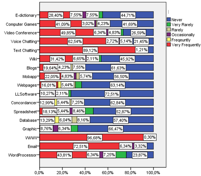 ) surveyed and compared the level of digital literacy skills of two L2 learner groups in two different learning contexts involving 100 L2 EAP learners at a university in Australia and 70 L2 EFL learners in Japan. Their results showed higher self-ratings of computing skills for EAP Australian learners but higher scores in actual knowledge of computer use as measured by a digital literacy test for Japanese EFL learners. Most participants in both groups reported using computers for learning purposes (97%) and social networking services (91%) successfully and frequently. In terms of IT application use, concordance applications were never used while only Japanese EFL learners reported relatively frequent use of language learning software and video conferencing. Most participants in both groups rated their skills for using virtual worlds, podcasts and web design applications as poor. A lack of digital literacy knowledge was overwhelmingly reported as the most common factor to influence the proper use of digital technologies while, overall, all participants held positive attitudes toward the use of digital technologies. Using an adapted version of Son, Robb, and Charismiadji’s(2011