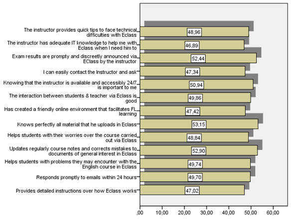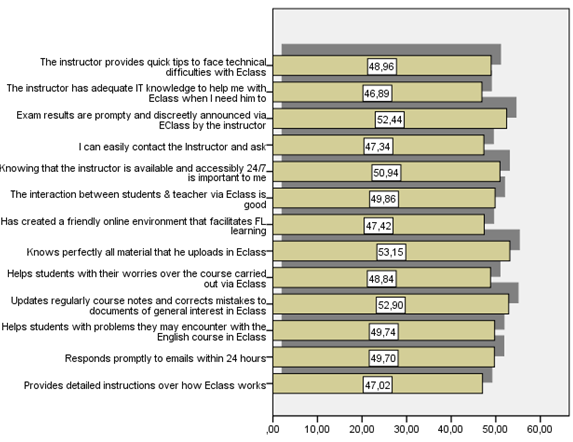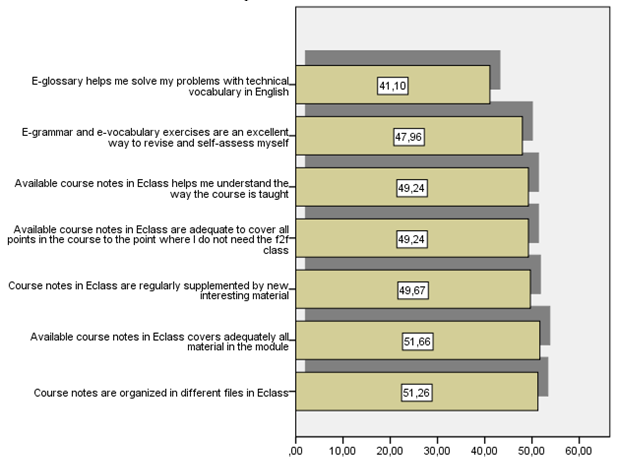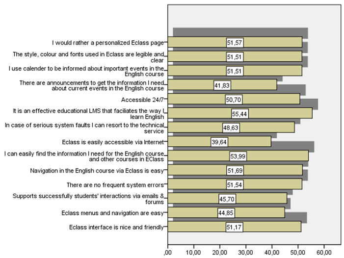 Finally, a 44-item Learner Satisfaction questionnaire based on Ozkan and Koseler’s (2009) study was adapted to fit the context of our study by retaining and modifying items that were suitable for the assessment of our L2 learners’ satisfaction with certain aspects of the online component of the BL language course they were currently attending. The final version of our questionnaire was translated into Greek and consisted of statements aimed to assess learner satisfaction in the following areas: (i) perceived learners’ satisfaction with e-learning via the use of the Open eClass LMS platform (items 1-11), (ii) instructor’s supportive role in the e-learning module of the BL course (12-24), (iii) system quality (items 25-38) and (iv) content quality (items 39-44). Participants were asked to provide their answers via a 5-point Likert scale (1-strongly disagree to 5-strongly agree). Cronbach’s alpha coefficients for the Greek version of the questionnaire were found to be .83 for perceived learners’ satisfaction, .91 for instructor quality, .87 for system quality and .88 for system quality, and .95 for overall scale.