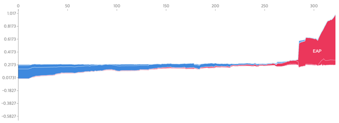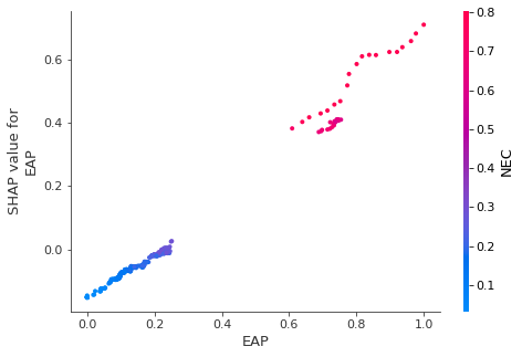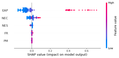 Figure 8 is the result of accumulating and loading Shapley's influence on all data. As a result of the vertical accumulation of data such as that in Figure 6 the vertical accumulation of the entire dataset can be depicted. As can be seen from the form of the graph, the economically active population (EAP) was the factor that had the most influence on the artificial intelligence model’s predictions of the number of teachers. The lower the value of the economically active population, the lower the number of teachers predicted, and the higher the value, the higher the number of teachers predicted.