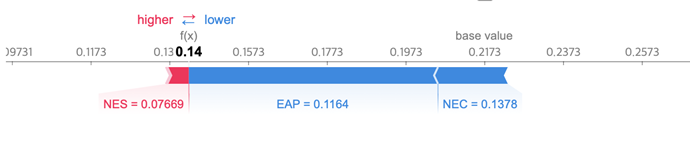 Figure 7 depicts the result of arranging the Shapley values for the prediction of the number of teachers in Gangwon-do in 2019 on a one-dimensional plane. As shown in Figure 7, the model estimates the number of teachers as 0.14, and this value is very similar to the actual value of 0.142. In this case, the factor that most negatively influenced the estimate of the number of teachers was the economically active population (EAP). In addition, the number of students (NES) was a factor that positively influenced the estimation of the number of teachers.