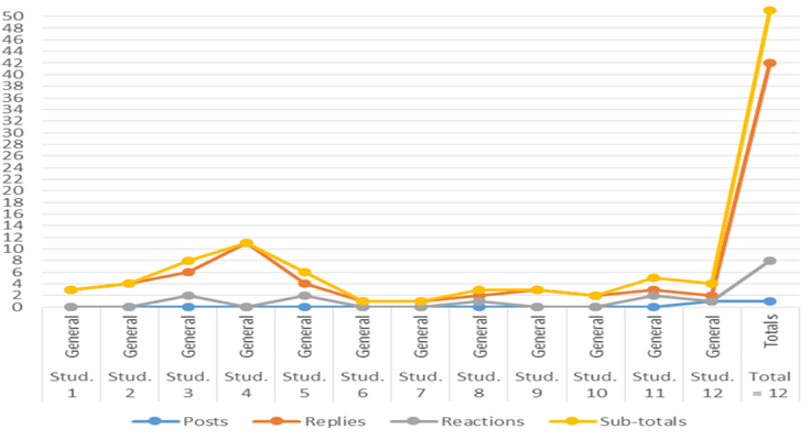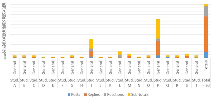 Figure 4  l displays participants’ overall messages, which consisted of three categories: posts (n = 1), replies (n = 42) and reactions (n = 8). These message types corresponded to how user messages are classified on MS Teams’ General tab.  On the whole, there was one post (original message) that generated 42 replies and 8 reactions. One student posted the most replies (n = 11) and was followed by one student with 6 replies and by two students who posted 4 replies each.