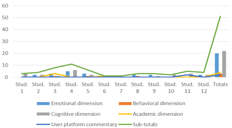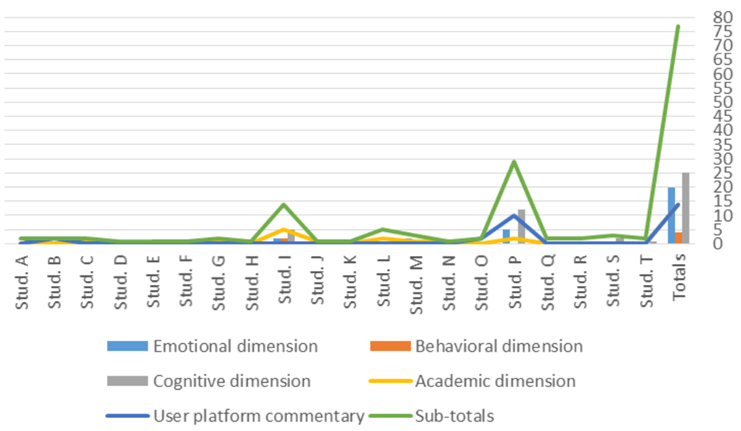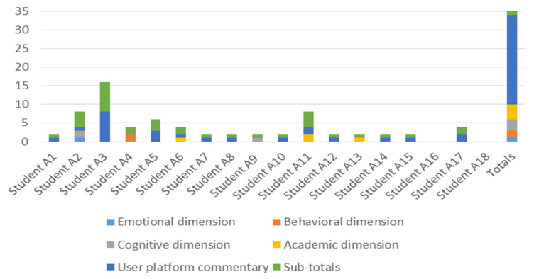The second coding scheme for the three data sets comprised six columns labeled participants, emotional dimension, behavioral dimension, cognitive dimension, academic dimension and user platform commentary, respectively. These labels were the themes that represented student engagement and constituted the units of analysis in each data set. In each case, two researchers coded and rated the data sets. Disagreements were resolved through consensus. The two researchers’ coding reliability was .90, which according to Cohen’s κ value weightings, is excellent (Chaka, 2020b; Cohen, 1960).