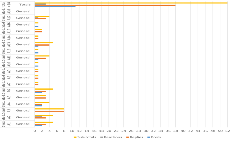 The message types of the 18 participants in this cohort are displayed in Figure 6. Overall, there were 11 original messages from which 38 replies and 3 reactions emerged. These original posts came from 8 students, with 2 posts each coming from three students. Of the 38 replies, 8 replies came from one student who had not posted any original message and four replies were posted by one student. By contrast, six students posted 3 replies each, with two students posting 2 replies each. The remaining four students posted 1 reply each, while the other students did not post any reply. There were 3 reactions from two students. In all, there were 52 messages posted during this virtual class session.