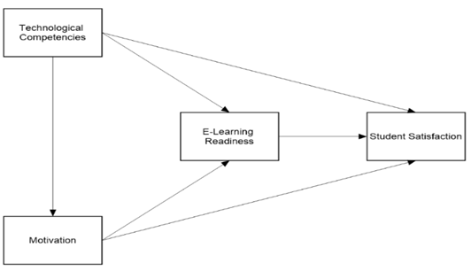 E-learning is the trend  or the most widely applied learning model in higher education today, especially during the COVID-19 pandemic (Almaiah, Al-Khasawneh, & Althunibat, 2020; Butola, 2021; Hamid, Aditama, Permata, Kholifah, Nurtanto, & Majid, 2022). The development of technology in the 21st century has brought significant changes, especially for higher education which  shares a closeness  with technology (Stuchlikova, 2016). Shifting the learning model from classical (learning in physical space) to e-learning (learning in virtual space) is a challenge that must be faced (Mishra, 2007). E-learning is a learning model that is integrated with media, methods, educational technology and information and communication technology (internet, digital platforms, computers and teleconferencing) in the learning process (Holmes & Gardner, 2006). This form of learning has become an important option to transform learning pedagogy into andragogy, heutagogy and cybergogy, which can make  significant contributions to successful learning outcomes (Saripudin, Sumarto, Juanda, Abdullah, & Ana, 2020; Zare, Sarikhani, Salari, & Mansouri, 2016). Through the use of e-learning, students and teachers can create a  very effective  and efficient learning climate, where access to important resources needed for theory and practice such as e-books, journals, video tutorials and systematic procedures, is very easy  (Jawad & Shalash, 2020; Scott, Morris, & Marais, 2018; Shrivastava & Shrivastava, 2020) . This is certainly very helpful in achieving the goal of competence to the fullest. Several relevant studies have identified  e-learning  as having complete features that  create opportunities for students to   experience innovative, communicative, collaborative and literary  learning climates (Shah & Barkas, 2018; Wali & Popal, 2020). Likewise, lecturers' teaching assignments have also changed significantly as they become more flexible in managing virtual classes without being present in physical classes (Osman, 2020). In essence, compared to the physical space learning model, e-learning has clear advantages, especially in terms of flexibility (space and time flexibility) during the learning process. However, implementing e-learning requires meeting the main needs or aspects to ensure success. In implementing the e-learning model in developing countries such as Indonesia, the most important step to be taken is to increase student satisfaction with online learning system services (Gay, 2016; Widyanti, Hasudungan, & Park, 2020). Student user satisfaction  of electronic learning system services is an important aspect that must be  seen to by higher education institutions (Pereira, Ramos, Gouvêa, & Da Costa, 2015). Student satisfaction is defined as the response to feelings caused by the match between expectation and reality from the learning process (Pritchard, 2009). Student satisfaction is also an important indicator of success in achieving competence through learning (Dziuban, Moskal, Brophy, & Shea, 2019). Yilmaz (2017) revealed that student satisfaction in using e-learning system services would foster students' positive attitudes to encourage them to learn optimally. In providing optimal online learning service satisfaction to students, Topal (2016) identified  important  steps to support satisfaction,  mainly through increasing the readiness of aspects that  are needed for e-learning. In this context, the readiness of students to engage in e-learning can increase student satisfaction in learning using this method. On the other hand,  readiness for e-learning  among students is also an important indicator of the successful implementation of e-learning in universities (Dziuban et al., 2019). E-learning readiness is an assessment or measurement tool to identify  the extent to which an institution is ready to adopt and implement e-learning, in relation to important aspects or factors that influence it Holmes and Gardner (2006). According to Mabrur, Suwartono, and Lutfiana (2021); Watkins, Leigh, and Triner (2008), e-learning readiness  refers to the level of physical readiness  of the infrastructure in the institution needed to implement the e-learning process. E-learning readiness is also defined as the factors that must be met before e-learning implementation can be successful (Oketch, Njihia, & Wausi, 2014). Several relevant studies identify student dissatisfaction caused by unpreparedness to follow e-learning as the dominant factor contributing to failure in implementing e-learning (Coşkun, Özeke, Budakoğlu, & Kula, 2018; Widyanti, Hasudungan, & Park., 2020) .  Past research has identified the weak readiness of students in using e-learning, especially in the case of higher education where achievement in cognitive and psychomotor competencies has failed due to low e-learning readiness, as reported by researchers during the COVID-19 pandemic.   In such situations, it is very important to measure and strengthen e-learning readiness to assist vocational education institutions in measuring each stage of their readiness, starting  with gap analysis to redesigning strategies to facilitate e-learning implementation (Alqahtani & Rajkhan, 2020; Nwagwu, 2020).  Aspects that affect  the readiness of e-learning  are technological competence and learning motivation which play   important roles in encouraging the implementation of e-learning  effectively and efficiently (Al-araibi, Mahrin, & Yusoff, 2019). Technological competence is the basis for understanding and mastering the technology used to implement e-learning (Arifin, Nurtanto, Warju, Rabiman, & Kholifah, 2020; Majid, Fuada, Fajri, Nurtanto, & Akbar, 2020; Nurtanto, Widjanarko, Sofyan, Rabiman, & Triyono, 2019; Soler & Blazquez-Parra, 2022) . According to Elkaseh, Wong, and Fung (2015), without adequate technological capabilities, the main aims and objectives of e-learning cannot be fulfilled.